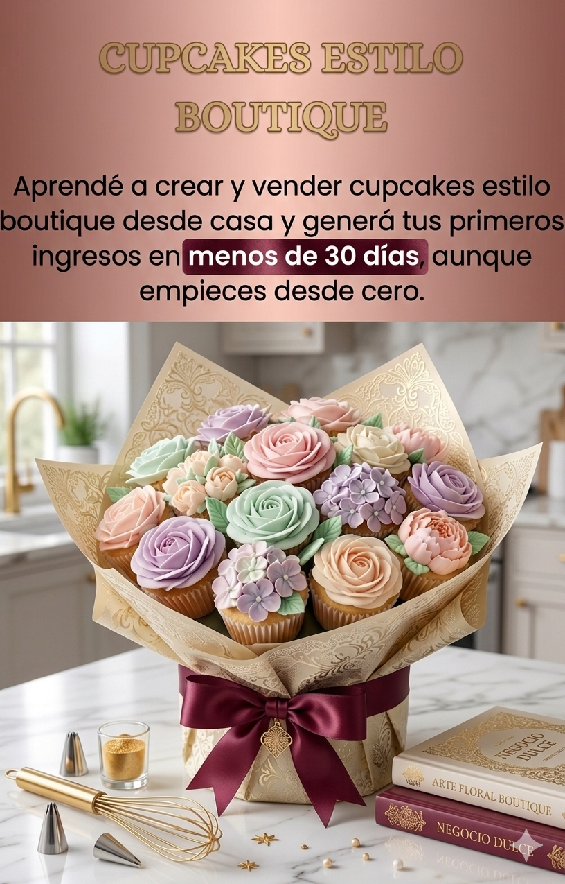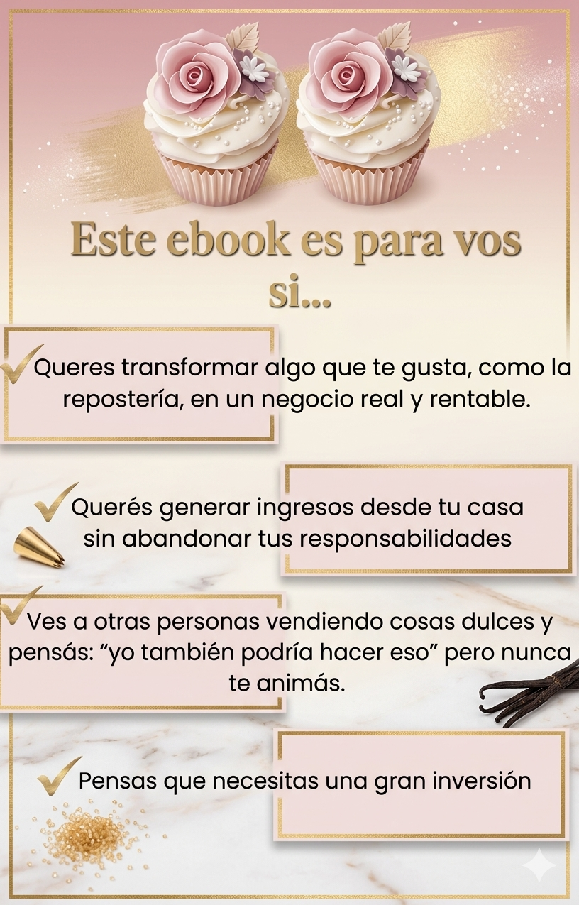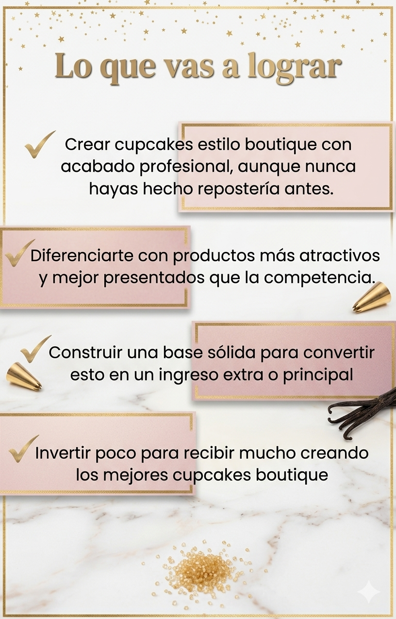 No es solo recetas. También vas a aprender lo básico para empezar a vender, poner precios y ofrecer tus cupcakes de forma atractiva.